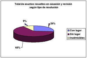 Del total de asuntos resueltos en casación y revisión, 65% fueron declarados sin lugar, 26% con lugar y 9% inadmisibles.