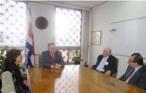 | El Presidente de la Corte Suprema de Justicia, Luis Paulino Mora Mora, se reunió con la delegación peruana. Los acompaña el Director de la Escuela Judicial, Marvin Carvajal Pérez. |