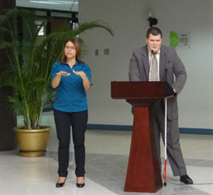 Cuando estudiaba la carrera de derecho, algunos profesores le dijeron que no podría ejercer la profesión por ser una persona con discapacidad visual… Años después, Melvin Barrantes Chaves concursó para el puesto de fiscal y logró su meta en el año 2012. “Oferté para fiscal y ahí empezó una experiencia muy bonita en el seno del Poder Judicial, ya que me dieron todos los instrumentos necesarios para que yo pudiera optar a este proceso de selección” dijo Melvin Barrantes, quien hoy se desempeña como fiscal en la Fiscalía Adjunta de Pérez Zeledón. “Las personas con discapacidad queremos laborar, pero hay obstáculos y es ahí donde la institución ha dado el ejemplo, porque esos obstáculos han sido levantados” puntualizó el fiscal. Melvin Barrantes narró su experiencia laboral durante la conmemoración del Día Internacional de las Personas con Discapacidad, organizada por la Subcomisión para el Acceso a la Justicia de Personas con Discapacidad y la Unidad de Acceso a la Justicia , el pasado el 3 de diciembre. La Magistrada de la Sala Primera Carmenmaría Escoto Fernández, coordinadora de la Comisión de Acceso a la Justicia, hizo mención del compromiso institucional para la promoción de los derechos de las personas en condición de vulnerabilidad, especialmente de las personas con discapacidad. “Se han realizado acciones orientadas a capacitar y concienciar al personal judicial, sobre los derechos de esta población desde la Escuela Judicial, las Unidades de Capacitación del Ministerio Público, Defensa Pública, Organismo de Investigación Judicial, Gestión Humana y la Unidad de Acceso a la Justicia”, dijo la Magistrada Escoto Fernández.