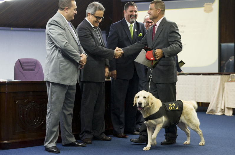 La perra Alana recibió una distinción por su eficiencia al detectar drogas. El premio lo recibió el guia, Cristian Corrales. En la foto aparecen, de izq. a der. Gerald Campos, subdirectror del OIJ, el magistrado José Manuel Arroyo y el ministro de Seguridad, Gustavo Mata | LUIS NAVAROO