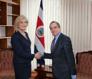 La Presidenta de la Corte Suprema de Justicia, Zarela Villanueva Monge recibió al nuevo Embajador de Francia, Sr. Thierry Vankerk-Hoven. El encuentro permitió conocer el sistema judicial costarricense, así como las acciones de interés para ambos países. Dentro de los temas judiciales de principal interés para el Embajador está el Programa de Justicia Abierta y el combate contra el narcotráfico. El nuevo Embajador de Francia es graduado del Instituto de Estudios Políticos y de la Escuela Nacional de Administración. Ha desempeñado varios cargos en el Ministerio de Asuntos Exteriores y en el exterior como; Primer Secretario en México, Segundo Consejero en Kuala Lumpur y Londres, Primer Consejero en Madrid y Cónsul General en Boston. El señor Vankerk-Hoven es el Embajador de Francia en nuestro país desde el pasado 28 de setiembre. La visita se realizó en el Despacho de la Presidencia de la Corte Suprema de Justicia el pasado 1 de noviembre. |