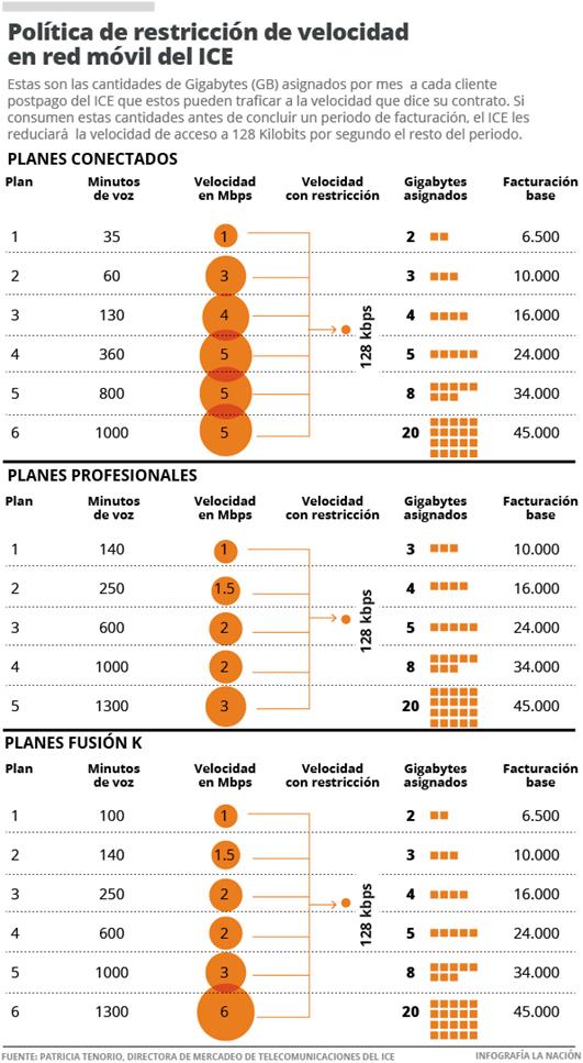 La restricción en la velocidad del Internet móvil ya la aplicaban los operadores Claro y Movistar. En el caso del ICE, según el plan contratado, los clientes pueden descargar entre 2 y 20 gigabytes al mes. Quienes rebasen ese límite, verán reducida la velocidad a 128 kilobits por segundo, y volverán a la velocidad contratada hasta que se inicie el siguiente mes de facturación.