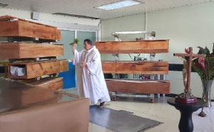 A las ocho de la mañana del viernes 27 de setiembre, el calor de las luces de un pequeño altar, dieron la solemnidad a una de las Salas de Patología Forense, donde tuvo lugar la misa, que daba el último adiós a 18 cuerpos no retirados de la Morgue Judicial de San Joaquín de Flores, Heredia.