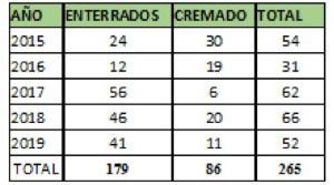 En los últimos cinco años se procedió con el entierro de 179 cuerpos y 86 fueron cremados, esto mediante un convenio de cremación que se tiene con una entidad privada. En estos casos las cenizas se conservan en custodia por cinco años, con toda la documentación, en caso de que alguna persona aparezca y solicite el retiro.