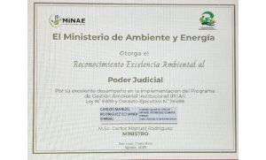 El Poder Judicial recibió un reconocimiento de excelencia ambiental por su desempeño en el Programa de Gestión Ambiental Institucional (PGAI) del Ministerio de Ambiente y Energía (MINAE), cuyo objetivo es destacar el buen desempeño de las instituciones públicas que hacen un uso racional de los recursos. La Magistrada y Coordinadora de la Comisión de Gestión Ambiental Institucional e integrante de la Comisión de Justicia Ambiental de la Cumbre Judicial Iberoamericana, Damaris Vargas Vásquez señaló que este galardón refleja el trabajo, compromiso y la responsabilidad socio-ambiental de la Comisión y las Subcomisiones de Gestión Ambiental, de todo el personal de las dependencias que promueven día a día buenas prácticas ambientales, así como el seguimiento constante y la experticia del Ingeniero Eugenio Solís, Regente Ambiental del Poder Judicial. “Sin duda, la clave del éxito está en el compromiso asumido en la ejecución del Plan de Gestión Ambiental por la alta gerencia institucional y especialmente, por el aporte que damos cada una de las personas servidoras judiciales desde nuestras competencias en pro del Ambiente. Es un modelo exitoso de responsabilidad ambiental institucional construido en equipo”, destacó la Magistrada Vargas Vásquez.