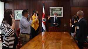 El Presidente de la Corte Suprema de Justicia, Fernando Cruz Castro realizó la juramentación de representantes propietarios y suplentes del Tribunal de Árbitros y Arbitradoras del Colegio de Enfermeras de Costa Rica. La juramentación se realiza en cumplimiento de lo establecido en el artículo 37 del Decreto Ejecutivo N° 18190 – S. Las personas juramentadas fueron del Colegio de Enfermeras de Costa Rica, la Dra. Gabriela Alpízar Portilla y el Dr. Randall Granados Soto; de la Dirección General del Servicio Civil, Alejandra Barrantes Monge y de la Caja Costarricense del Seguro Social, Víctor Zamora Murillo y Carol Hernández Rodríguez. “Es importante considerar y analizar en cada puesto que uno tiene, cuáles son las implicaciones éticas y morales de hacerlo bien y con compromiso, por lo que la juramentación es super importante para hacer conciencia de ello”, indicó la Dra. Gabriela Alpízar. “La juramentación les otorga a las personas que presentan los reclamos ante el tribunal, una garantía de que quienes estemos formando parte y resolviendo el tema, lo hagamos con la mayor objetividad”, señaló Víctor Zamora.
