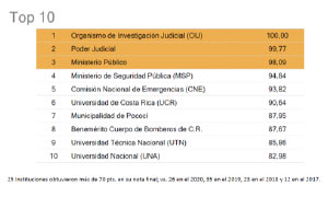 El Poder Judicial recibió el reconocimiento al segundo lugar en el Índice de Transparencia Institucional (ITSP) 2021, al obtener una evaluación de 99,77 de 255 instituciones públicas a las que se les evaluó sus sitios web. La evaluación del Índice de Transparencia del Sector Público es realizada anualmente por la Defensoría de los Habitantes, con el apoyo del CICAP de la Universidad de Costa Rica. El instrumento de medición tiene como fin último, fortalecer la institucionalidad costarricense a través de la evaluación de la transparencia en el acceso a la información pública que se encuentra disponible en los sitios web de las instituciones que conforman el sector público costarricense.